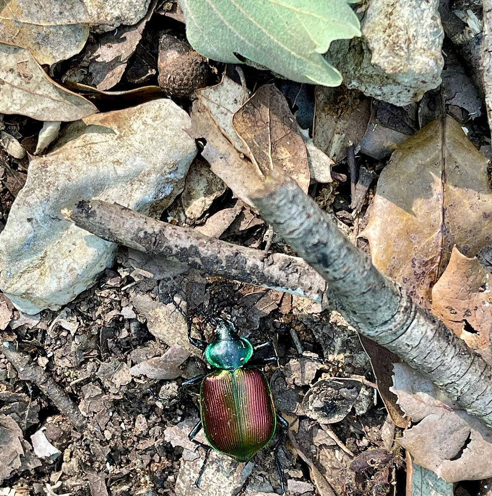 One participant found this tiny beauty. She'd written a piece on acorns and included this photo as there is one in the upper portion. However, the star of the show is this iridescent beetle, which immediately became our mascot.